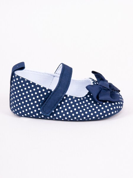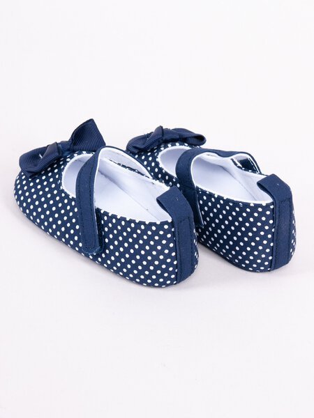 Tamsiai mėlyni taškuoti stilingi, lengvi ir patogūs batukai kūdikiams minkštais padukais puošti kaspinėliais. Batukai užsegami velkro juostele, dėl to puikiai laikysis ant kojytės ir bus patogu apauti.