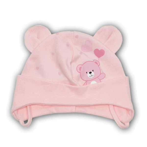 Rausvos spalvos švelnaus ir elastingo viengubo trikotažo kepurė mergaitei su raišteliais. Dydį rinkitės pagal vaiko galvos apimtį.