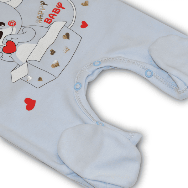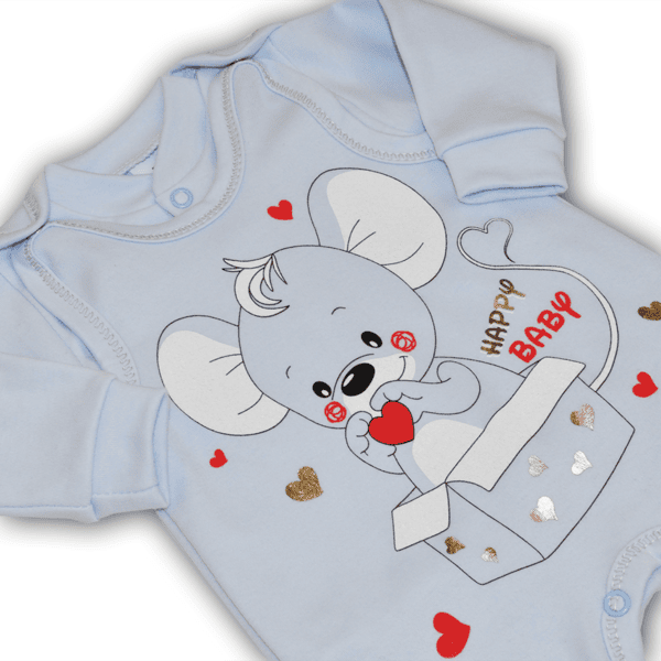 Melsvas komplektas kūdikiams: šliaužtinukas ir marškinėliai. Marškinėliai ilgomis rankovėmis priekyje susegami spaudėmis. Šliaužtinukai puošti žaismingu marginimu. Šliaužtinukų peteliai ir klynukas susegami spaudėmis. Pagaminta iš sertifikuoto, kokybiško, minkšto ir švelnaus trikotažo.