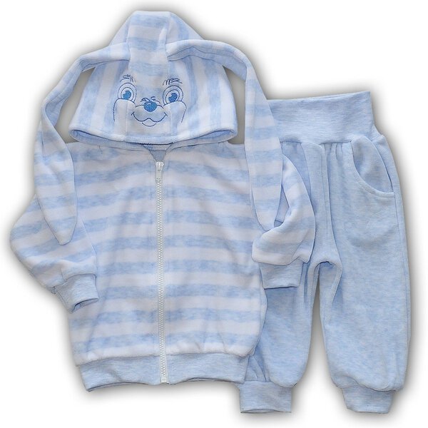 Melsvas medvilnės veliūro komplektas – džemperis su gobtuvu ir kelnės su kišenėmis. Džemperio gobtuvas puoštas siuvinėjimu ir ausytėmis, užsegamas užtrauktuku. Kelnių juosmuo be gumos, pagamintas iš minkštos, elastingos medžiagos, kad nespaustų vaikučiui pilvelio.