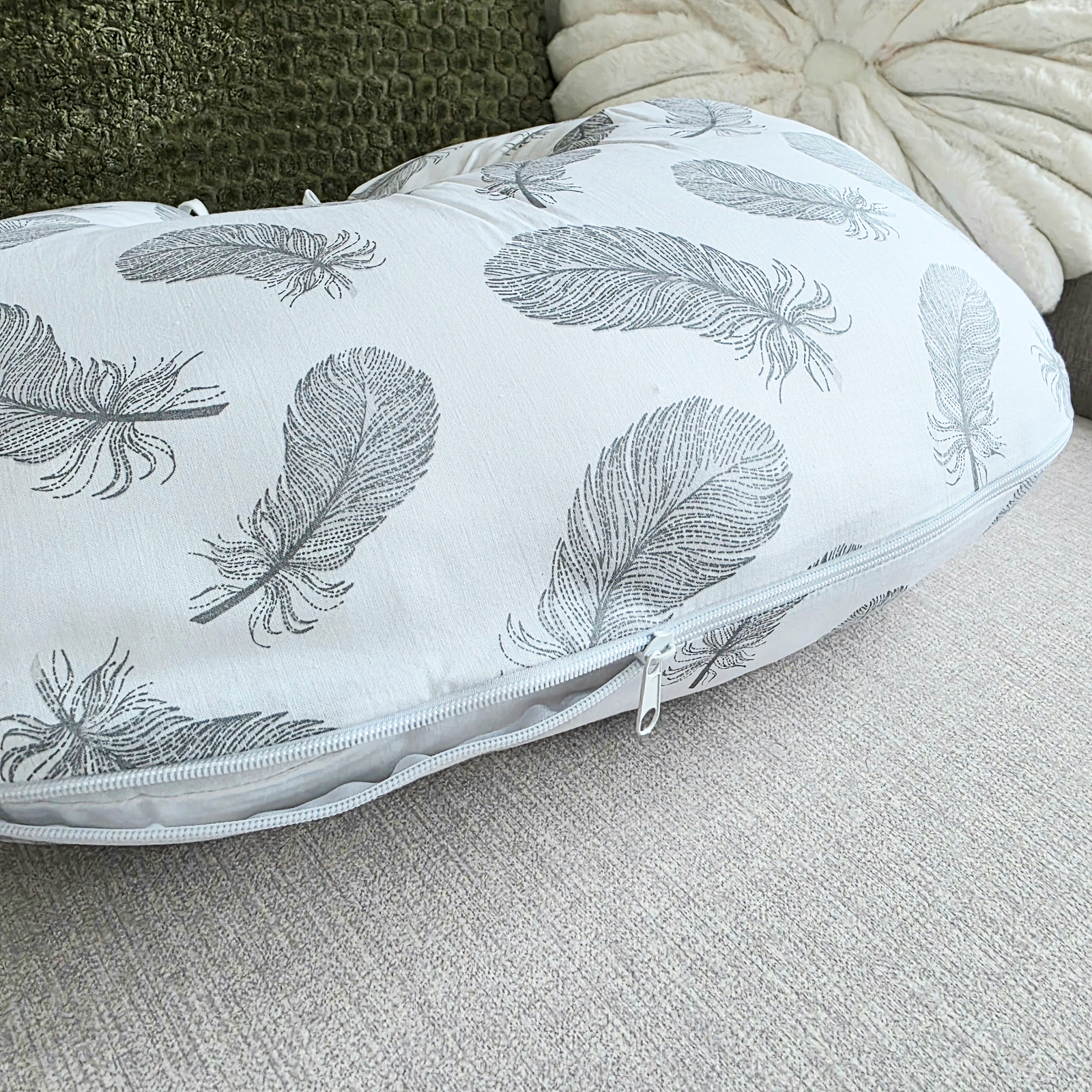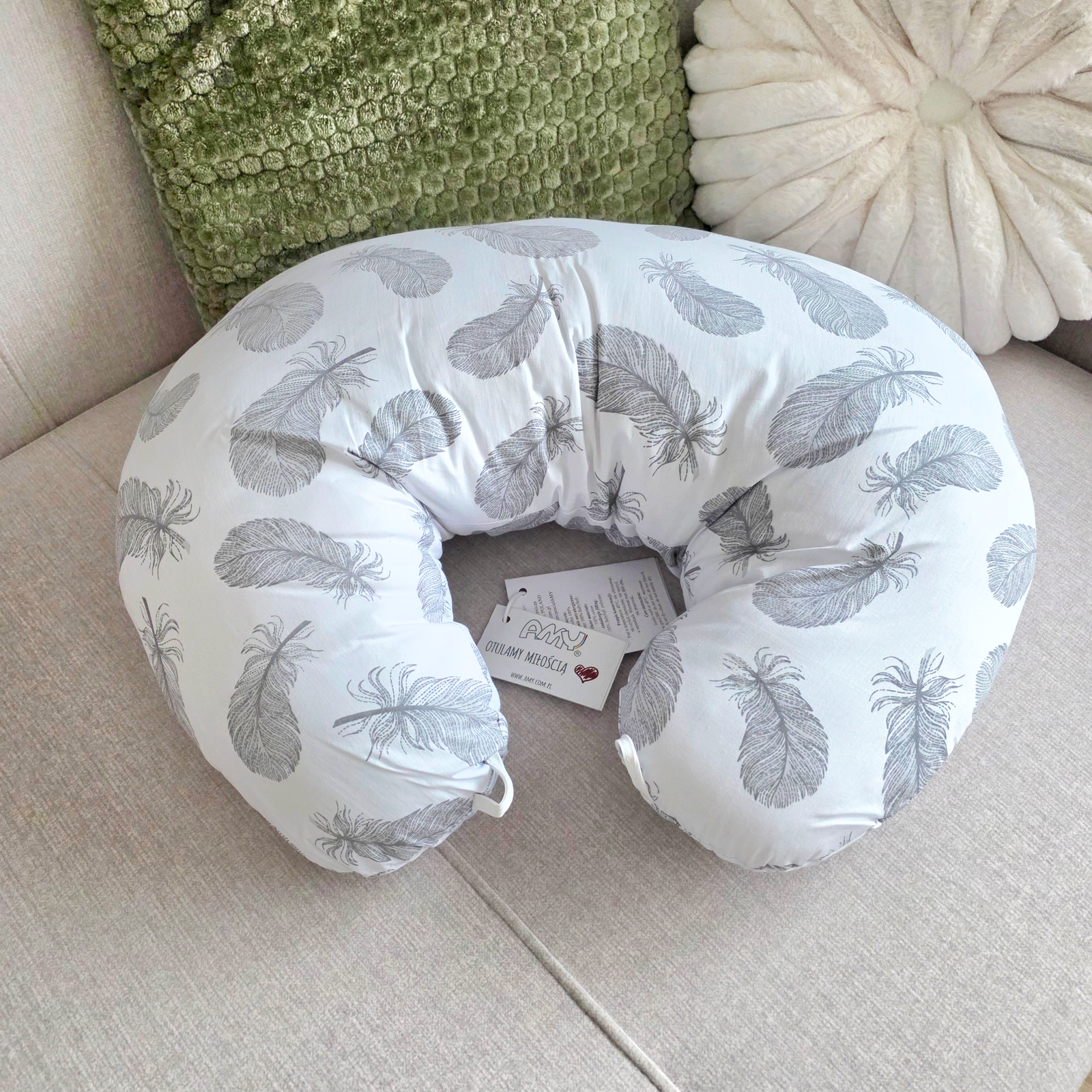 Maitinimo pagalvė, kuri padės patogiau ir lengviau pamaitinti kūdikį. Pagalvės užvalkalas užsegamas užtrauktuku, dėl to esant poreikiui galima nuimti ir išskalbti. Išmatavimai: 110cm.