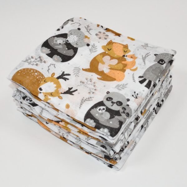 Šis marlinis medvilninis vystyklas, dekoruotas gyvūnų piešiniais, yra patrauklus ir lengvai derinamas kasdieniam naudojimui.