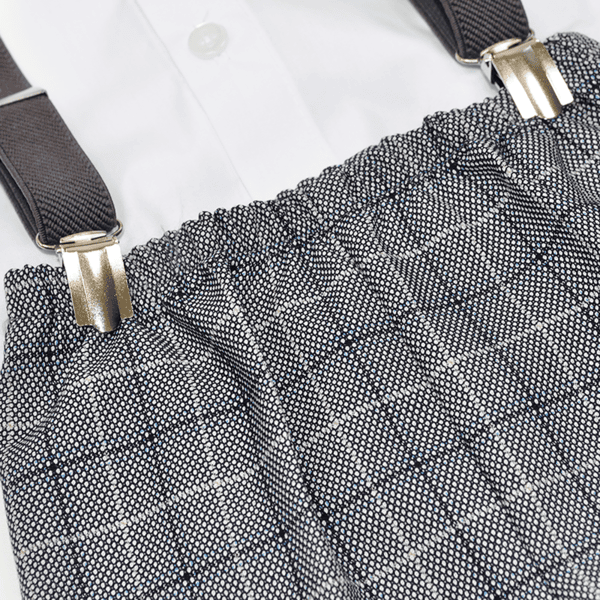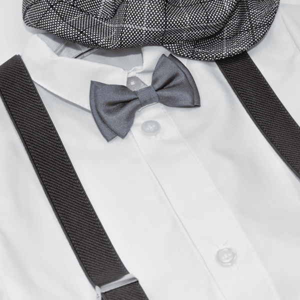 Pilkas languotas puošnus komplektas berniukui. Puikiai tiks krikštynoms ir kitoms šventėms. Komplektas yra pagamintas taip, kad būtų ne tik madingas ir gražus, bet ir patogus vaikui. Komplektą sudaro baltas tekstilinis smėlinukas trumpomis rankovėmis, varlytė, kepurė, šortai ir petnešos. Šortų juosmenyje guma, šortų medžiaga nėra tampri. Komplektas skirtas tiems, kas mėgsta stilių, patogumą ir aukštą kokybę!