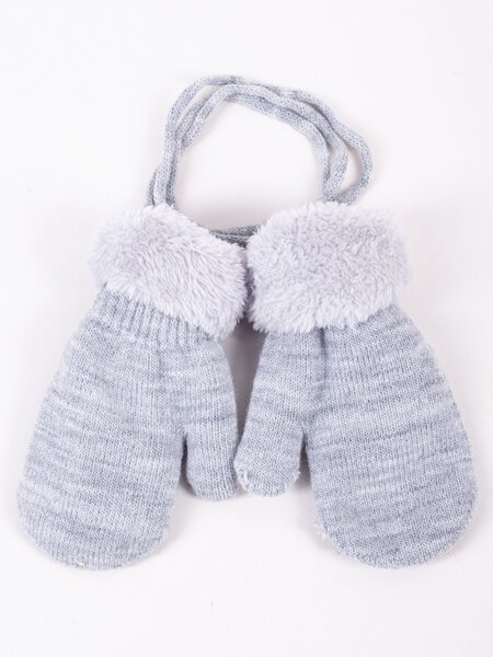 Pilkos šiltos dvigubos vaikiškos pirštinės su atvartėliu. Išorė megzta, viduje kailiukas. Pirštinės sujungtos virvele, kad nepasimestų.