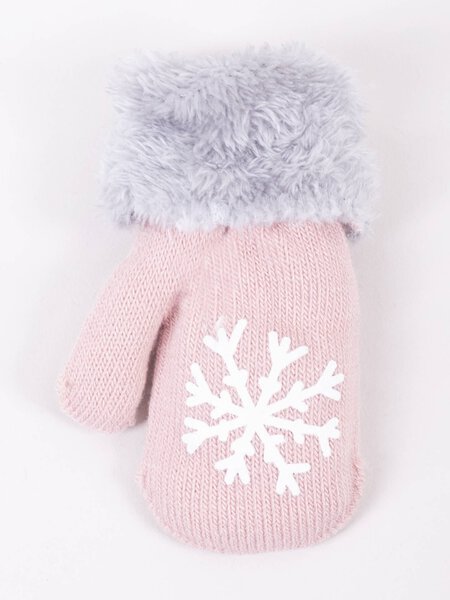 Rausvos kumštinės dvigubos pirštinės su kailiuku viduje su atvartėliu. Sujungtos virvele, kad nepasimestų.