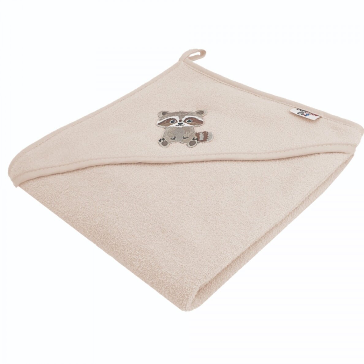Smėlio spalvos rankšluostis kūdikiui su gobtuvu.