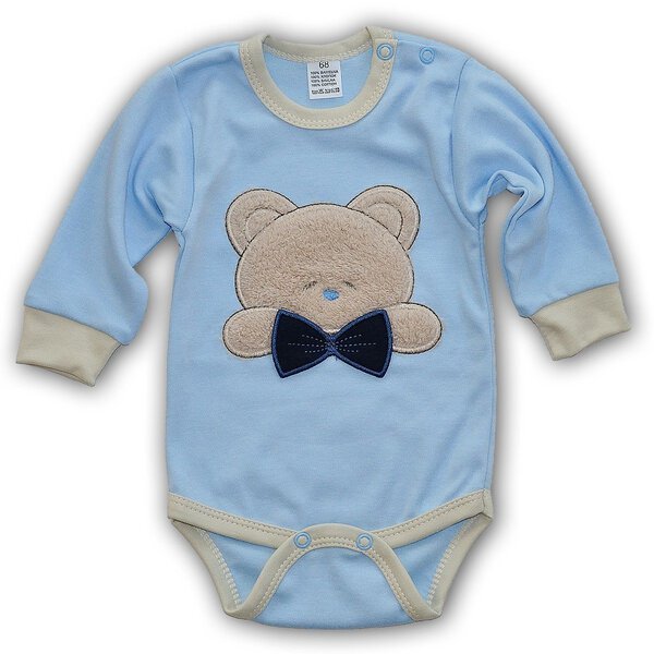 Melsvas smėlinukas puoštas meškučio aplikacija.