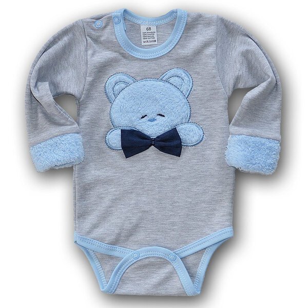 Pilkas smėlinukas puoštas meškučio aplikacija.
