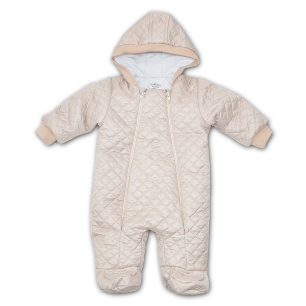 Šiltas smėlio spalvos neperpučiamas kombinezonas kūdikiui.