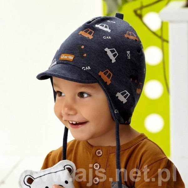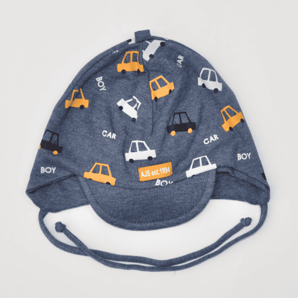 Džinso spalvos dvigubo švelnaus trikotažo kepurė su raišteliais.